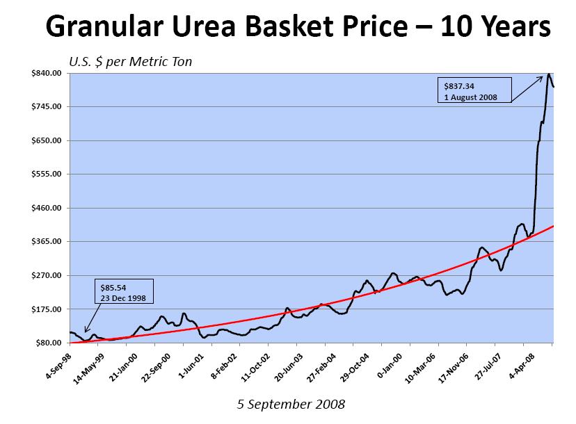 But the overall mood of the meeting was not. Our Fertilizer market has peaked. It has been a nice run; but we have covered too much ground, too quickly. This ten year graph of our weekly posted Granular Urea Basket Price reflects just how much the urea market has strayed above a moving trend line.
